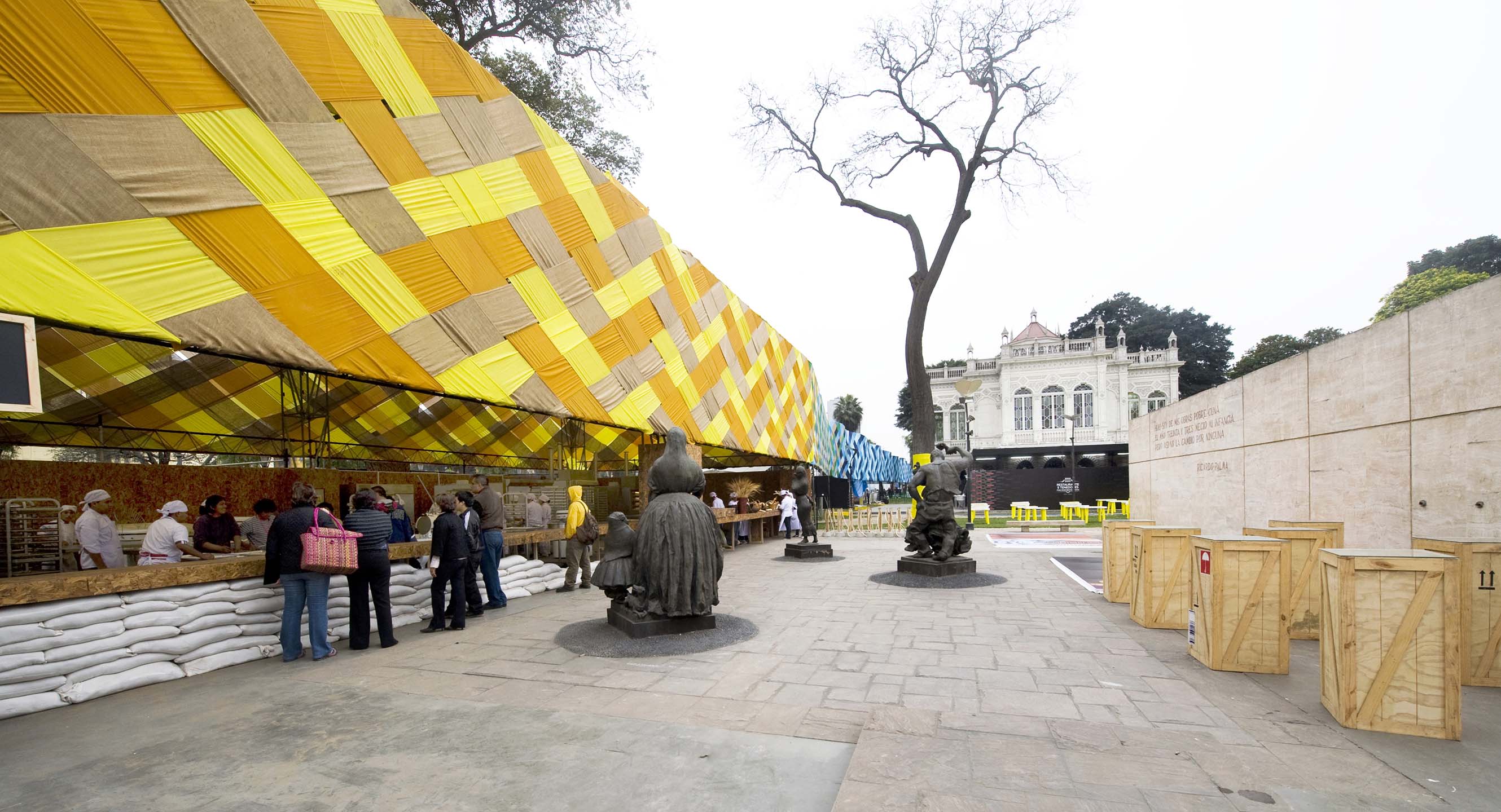 A huge amount of different pavilions had to be added to the existing architectural elements of the park, all attempting to call the attention of the 500,000 visitors. How did we neutralize those individual desires while equally liberating the park and its monuments? We aligned the entire program at the edges of the park in one sole temporary pavilion, 1.2km long, with changes in its shape and colour according to its contents: restaurants, food market, auditorium, bakery, restrooms... like a giant anaconda that swallowed them all.