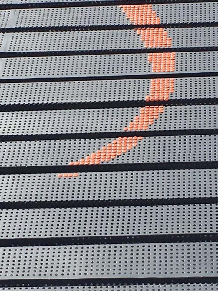 La Mar street in Miraflores, is in a radical transformation process. From a rough neighborhood of automotive garages and repair workshops with metal shutters, to trendy restaurants and glazed design stores. We were commissioned to design a new building for a print shop and open floor offices for graphic designers. The plot entailed a long and narrow (6m. x 40m.) 4 story structure with maximum working areas and minimum circulation spaces. We wanted to add a piece that preserved the original feeling of the area, so avoided a facade with the ubiquitous office glass curtain wall for a rougher perforated shutter wall, which could also be used as a low-tech billboard. So seasonally the building gets cheaply customized by the graphic designers, simply inserting plastic studs as pixels in the perforations.